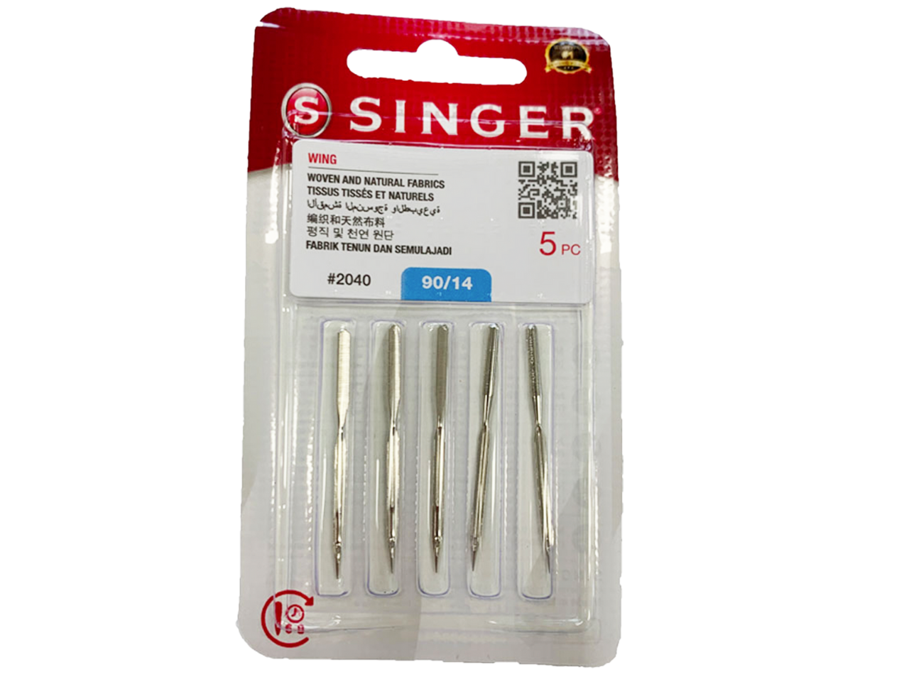 SINGER Hemstitch Wing Needles size 90/14 for woven fabrics of heavier weights of fabric. The needle punches a hole into the fabric while the sewing machine stitches around the piercing.